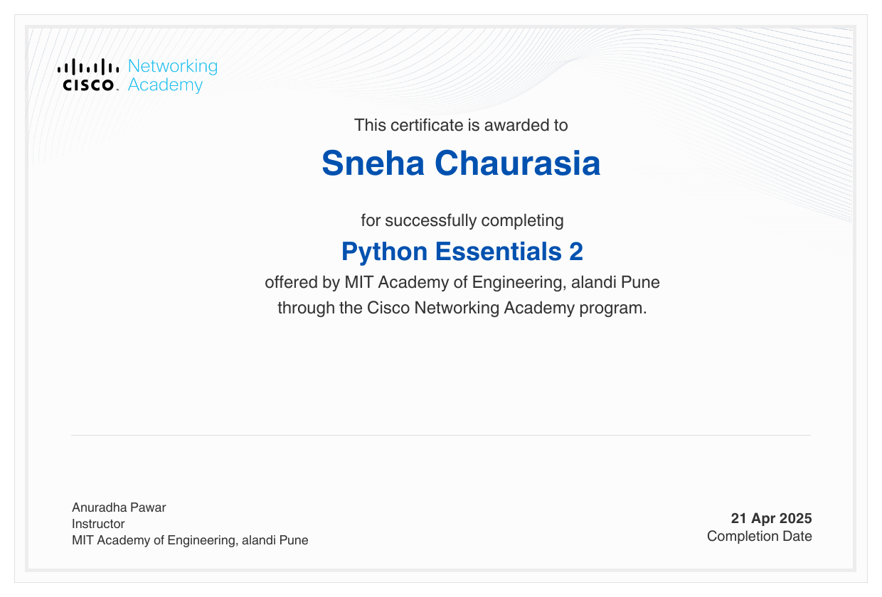 Completed the "Python Essentials-1" course by the Cisco Networking Limited. It was a beginner-level introduction.